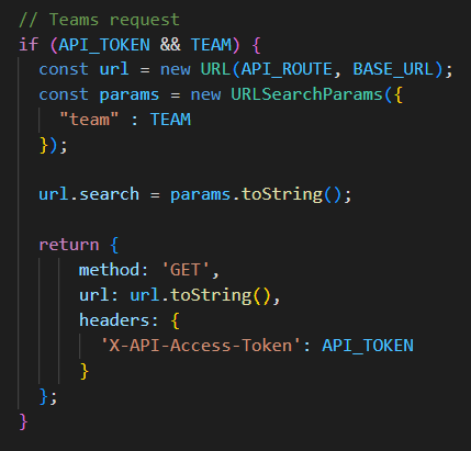 API filters and pagination are beyond the scope of this example. You can set custom filters and pagination by changing the const url and headers variables. Learn more at https://api.stackoverflowteams.com/docs.