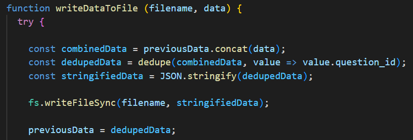The cron job calls a function to execute the script. That function is fetchAndWriteData(), which combines the makeRequest() and writeDataToFile() functions. When first called, the fetchAndWriteData() function waits for the results of the API call in the makeRequest() function. It then uses the writeDataToFile() function to prepare (deduplicate) the data and write it to the data file.