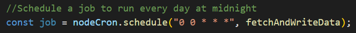 You'll then schedule a cron job with nodeCron's schedule() function. In this example, the cron job executes the fetchandWriteData() function every day at midnight.